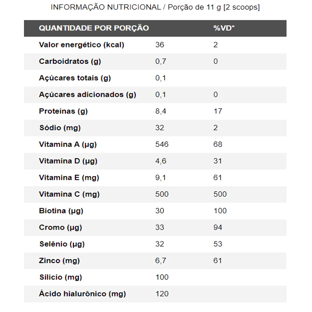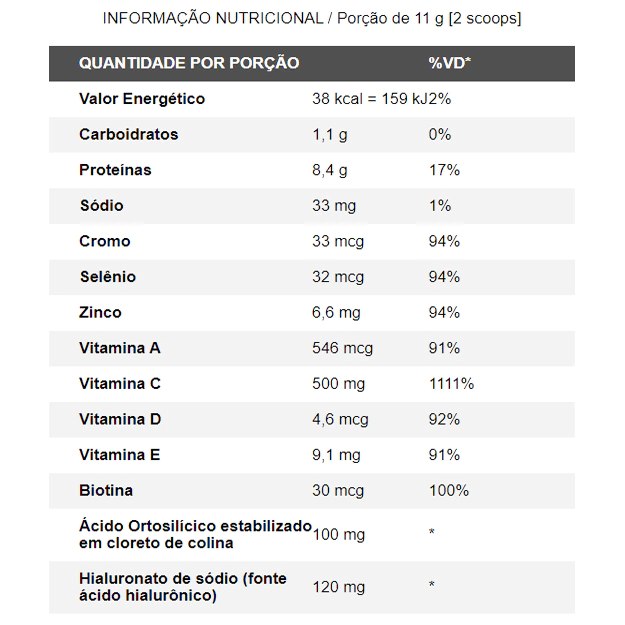 Limão: Colágeno hidrolisado, colágeno hidrolisado bioativo (Verisol®), vitamina C (ácido ascórbico), mix de vitaminas e minerais, hialuronato de sódio obtido pela fermentação de Streptococcus zoopidemicus, ácido ortosilícico estabilizado em cloreto de colina, aromatizante natural, acidulante ácido cítrico, edulcorante glicosídeos de esteviol (estévia). Não contém quantidades significativas de gorduras totais, gorduras saturadas, gorduras trans e fibra alimentar. (*)%Valores Diários não estabelecidos.