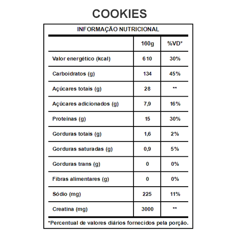 Cookies: Maltodextrina, proteína de soro do leite concentrada, amido de milho (Zea mays), creatina monohidratada, cookies, proteína de soro do leite isolada e aromatizante e edulcorante sucralose. ALÉRGICOS: CONTÉM DERIVADOS DE TRIGO, LEITE, CENTEIO, AVEIA E SOJA. PODE CONTER CEVADA. CONTÉM LACTOSE. CONTÉM GLÚTEN. DIABÉTICOS: CONTÉM GLICOSE.ALÉRGICOS: CONTÉM DERIVADOS DE LEITE E SOJA*. CONTÉM LACTOSE. Apenas o sabor cookies contém glúten. *Ingrediente utilizado no processo de fabricação da proteína de soro do leite com função de instantaneização.